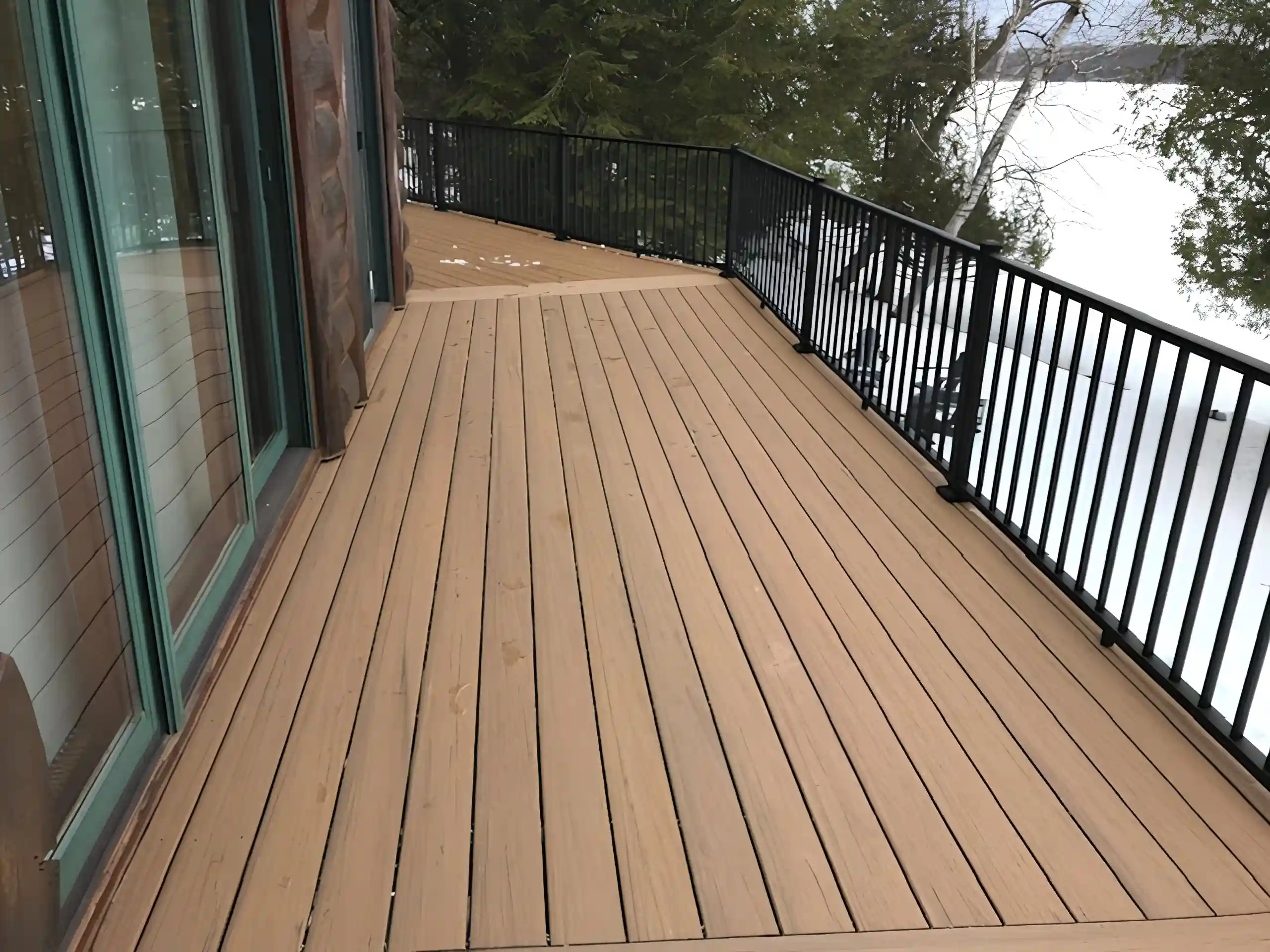 The new deck uses TimberTech Antique Leather composite boards for lasting durability and warm color. Westbury Tuscany aluminum railing in black provides safety without blocking the view. The wraparound design connects multiple entry points, and the stairway offers easy access to the lakefront.